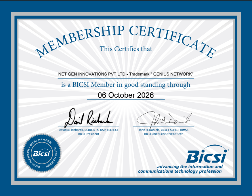 We are proud members of leading industry bodies such as the Telecommunications Industry Association (TIA) and BICSI, with certified professionals holding the prestigious Registered Communications Distribution Designer (RCDD) credential. Through active engagement with global technology associations, we stay ahead of compliance requirements and industry innovations. These memberships reinforce our credibility and highlight our commitment to delivering future-ready, standards-driven infrastructure solutions.